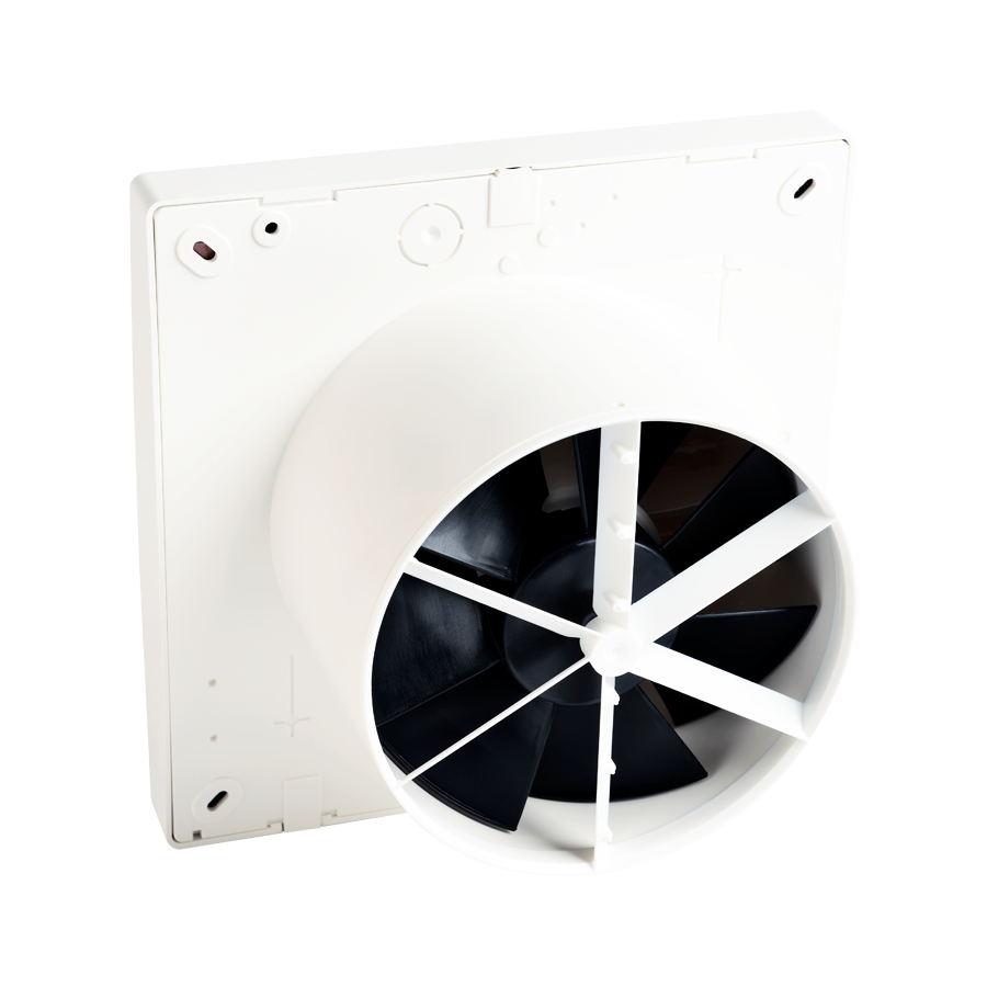 The fan is built with an integral timer and a humidistat. The fan can be switched via an external switch or the integral humidistat, which will trigger the fan once the relative humidity level exceeds a selectable threshold.