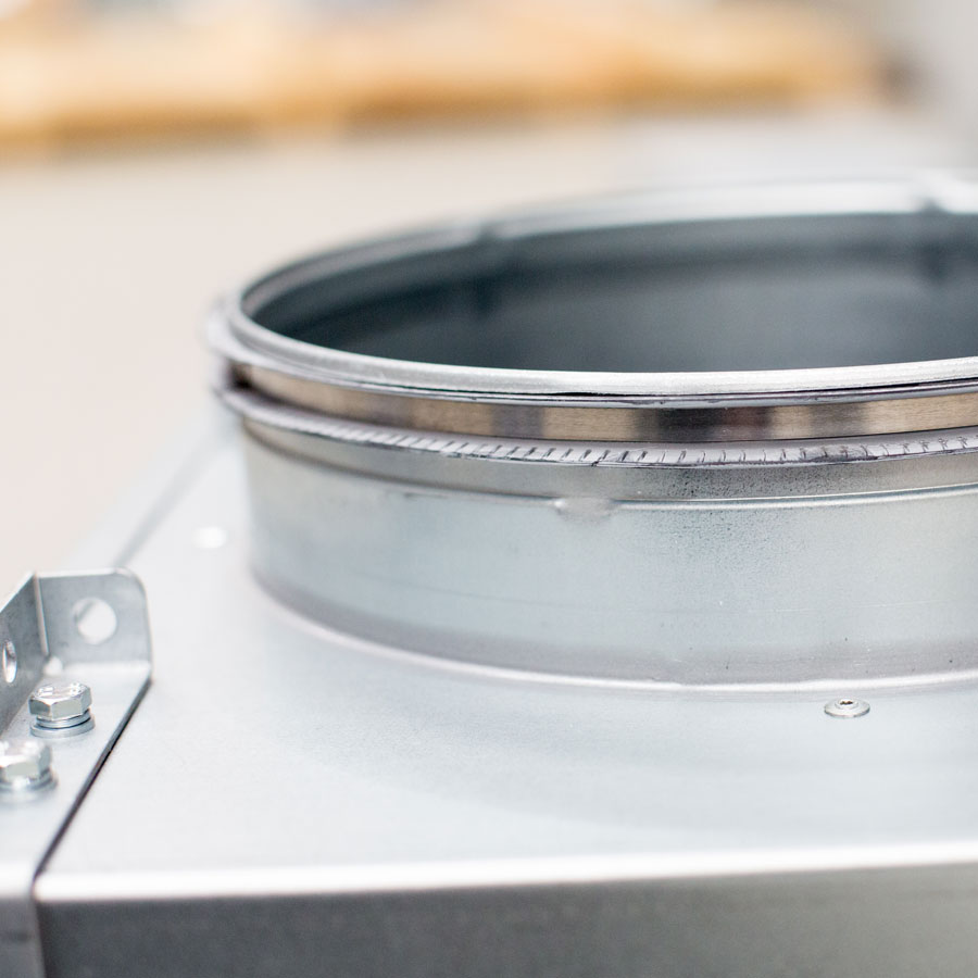 The robust 1.2mm galvanised mild steel sheet casing, is treated internally with a Class O rated (BS 476 Parts 6 and 7) fire resistant acoustic foam lining with a fire resistant polymeric coating. The wrap around folded casing is specially manufactured using integral motor mounting plates to provide additional rigidity for the casings. Each casing provides spigots to suit standard circular ducting. A removable lid is provided as a standard feature to facilitate ease of maintenance and cleaning.