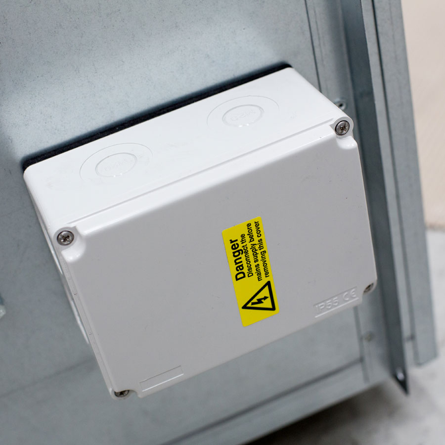 Electrical connection shall be via an IP55 terminal box mounted on the side for easy customer connection. Control shall be provided for applications Temperature, Relative Humidity, 0-10V, Constant Pressure and CO2 via separate sensor. Manual operation shall be provided by supplied LCD Display Unit. The unit shall incorporate pre-fitted in-duct temperature sensor for application Temperature without the requirement of a separate sensor. LCD Display shall allow adjustment of application parameters, operation of system automatically / manually and display of error messaging. Programmable time with four on / off functions per day shall be adjustable from the LCD Display Unit. Digital Input terminal connections shall be available for remote enable, fixed speed for boost speed or set back speed. Selection of Single, Twin and Master/ Slave fan arrangement shall be via LCD Display.