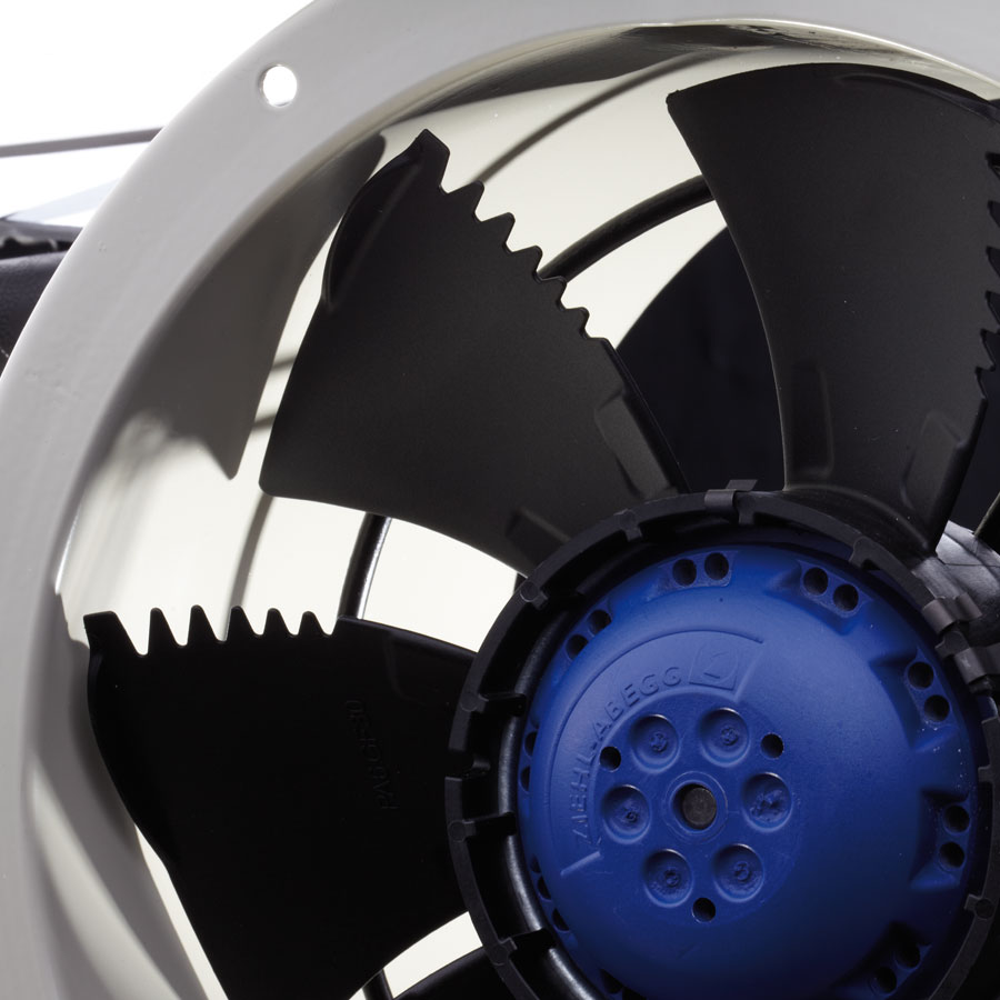 Impellers are high quality Ziehl-Abegg FE2owletwith Sickle shaped bladesin pressure die cast aluminiumor high performance composite material providing enhanced aerodynamic properties, low noise and reliability, dynamically balanced to ISO 14694 Grade G6.3 and finished in black (RAL 9005). Ziehl-Abegg Sickle Blade and FE2owlet impellers provide significantnoise reduction.